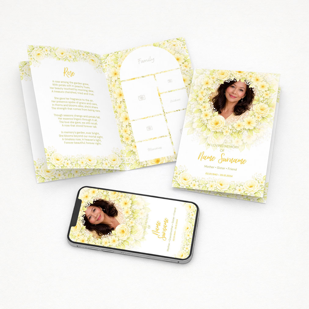 A soft yellow and green floral memorial suite featuring cheerful roses and meadow blooms, creating a warm and uplifting tribute.