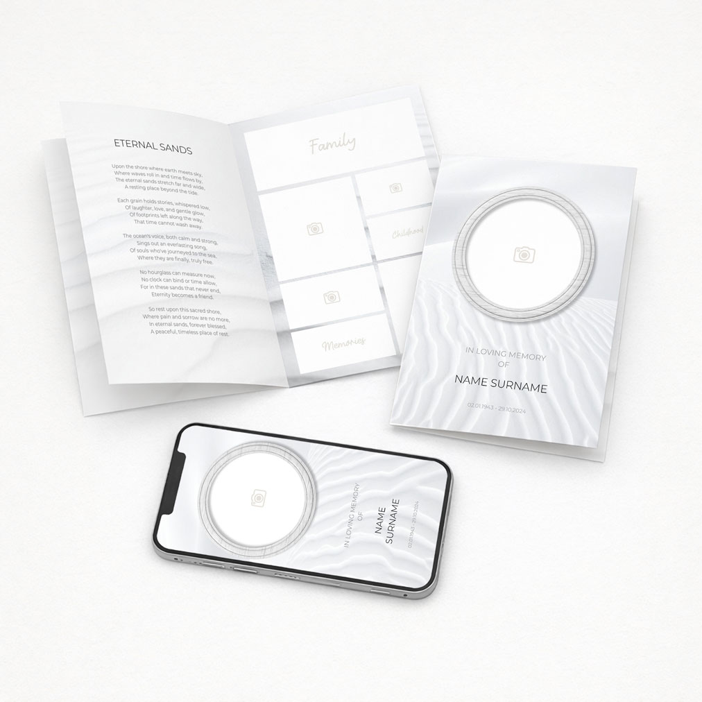 A serene coastal memorial suite featuring soft sand dune textures and gentle wave-like lines, creating a timeless and peaceful tribute.