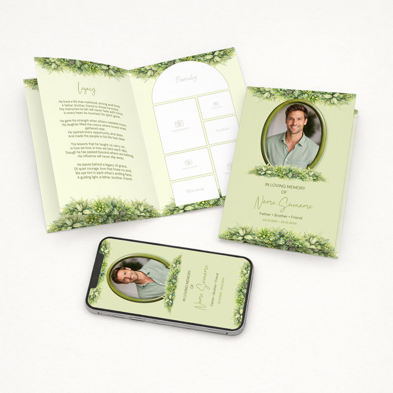 A warm botanical memorial design with layered greenery and soft natural textures. Forest Haven creates a comforting, garden-inspired tribute with organic depth and quiet sophistication.
