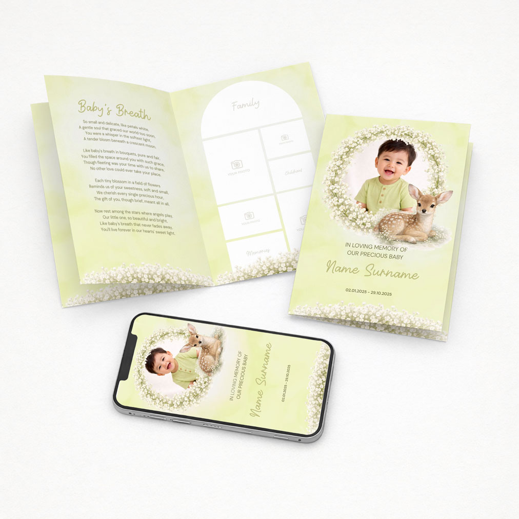 A gentle green baby memorial design with baby’s breath florals featuring a beautiful baby fawn. Friendly Forest delivers a gentle, loving tribute with gentle tenderness.