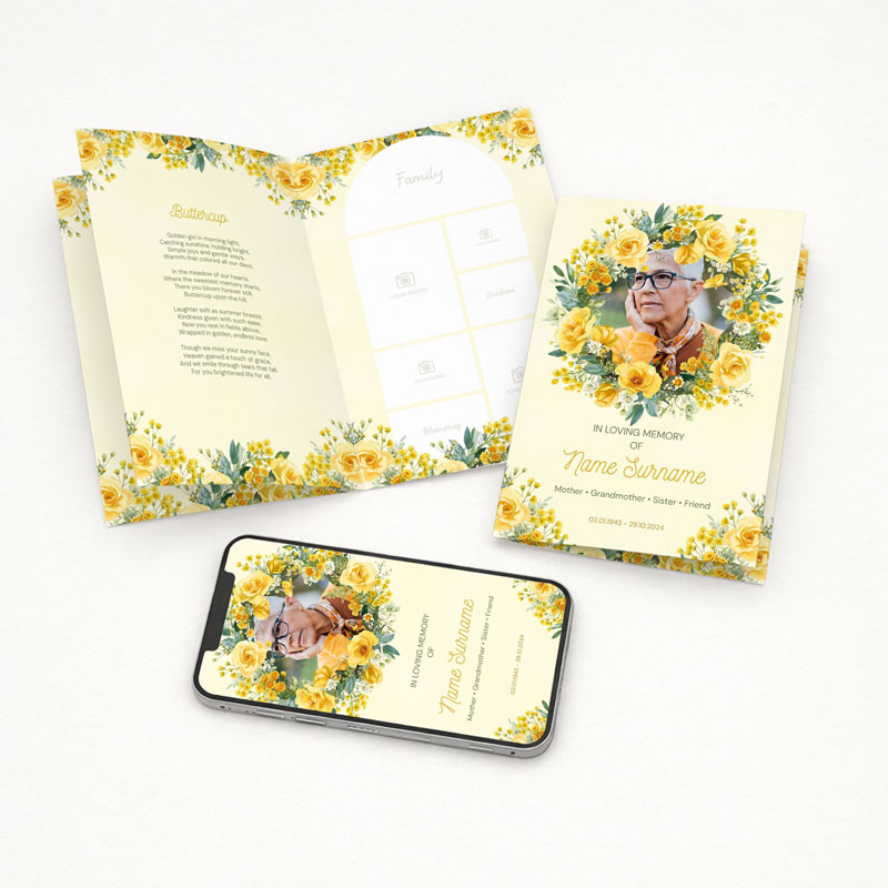 A luminous yellow memorial design framed with golden roses and warm floral accents. Golden Radiance delivers a bright, celebratory tribute filled with warmth and remembrance.