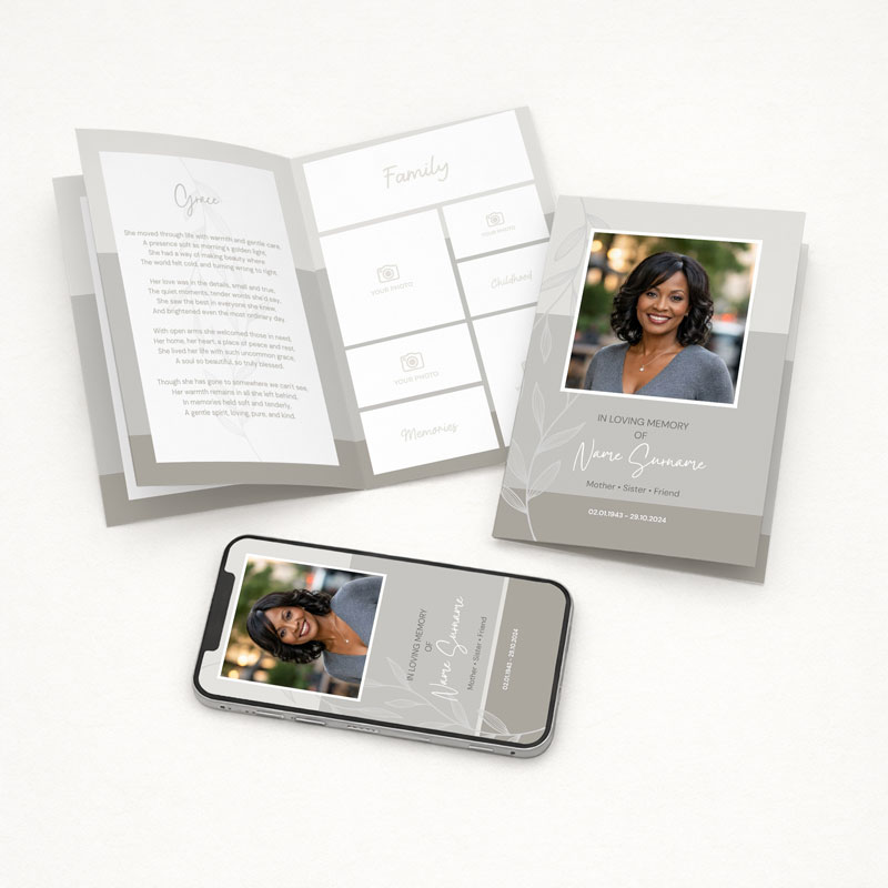 A soft grey memorial design featuring subtle botanical accents and layered neutral tones. Grey Willow offers a calm, contemporary tribute with understated natural elegance.
