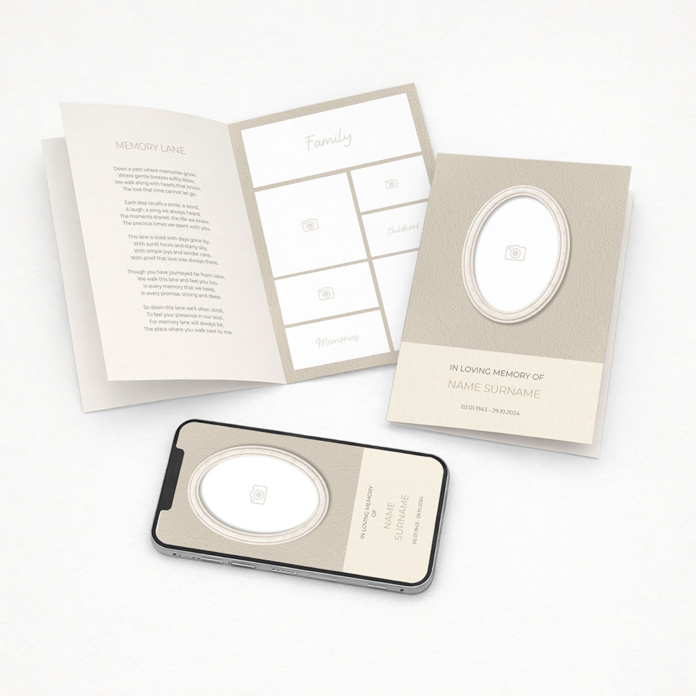 A refined memorial suite featuring warm neutral textures with an elegant oval frame, creating a grounded and dignified tribute.
