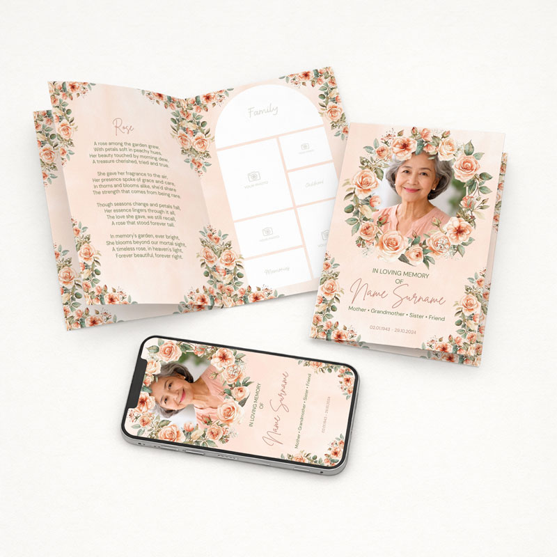 A soft peach memorial design with delicate rose florals and warm neutral tones. Peach Serenity provides a gentle, comforting tribute with refined feminine grace.