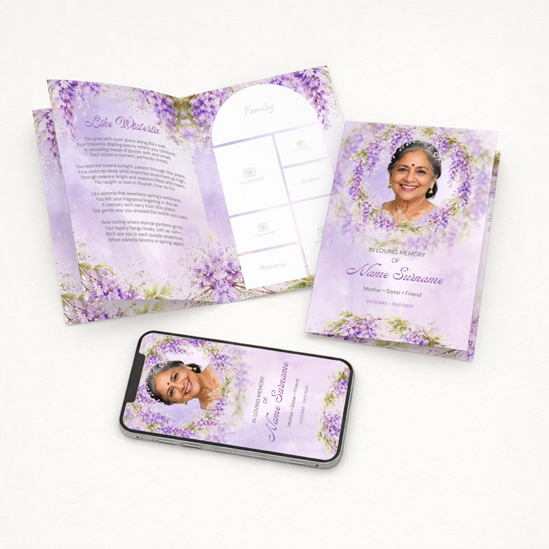 A soft lavender floral memorial suite featuring cascading wisteria blooms and gentle botanical textures, creating a serene and feminine tribute.